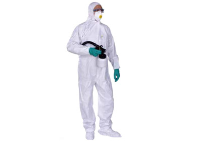 限次性無紡布連體服,70%聚丙烯+30%聚乙烯復合材料,彈性兜帽、袖口、腳踝口,防粉塵微粒,防輕度化學液體滴落,