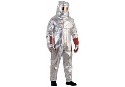 防金屬噴濺連體隔熱服,表面鍍鋁隔熱面料(不含石棉),頭罩帶有可更換鍍金大視野面屏,手套掌面為牛皮材質,靴套采用魔術貼粘貼