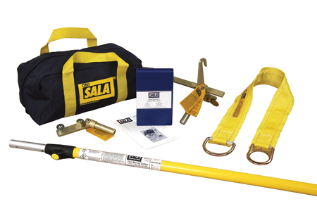 在頭頂上方高度無法夠到的位置設置防墜落掛點,桿子調節(jié)長度1.8米 至3.6米,掛點工具用于安裝吊帶,掛鉤工具用于安裝本公司3600磅開口負載的抓鉤,編織掛點吊帶0.9米和儲存包。