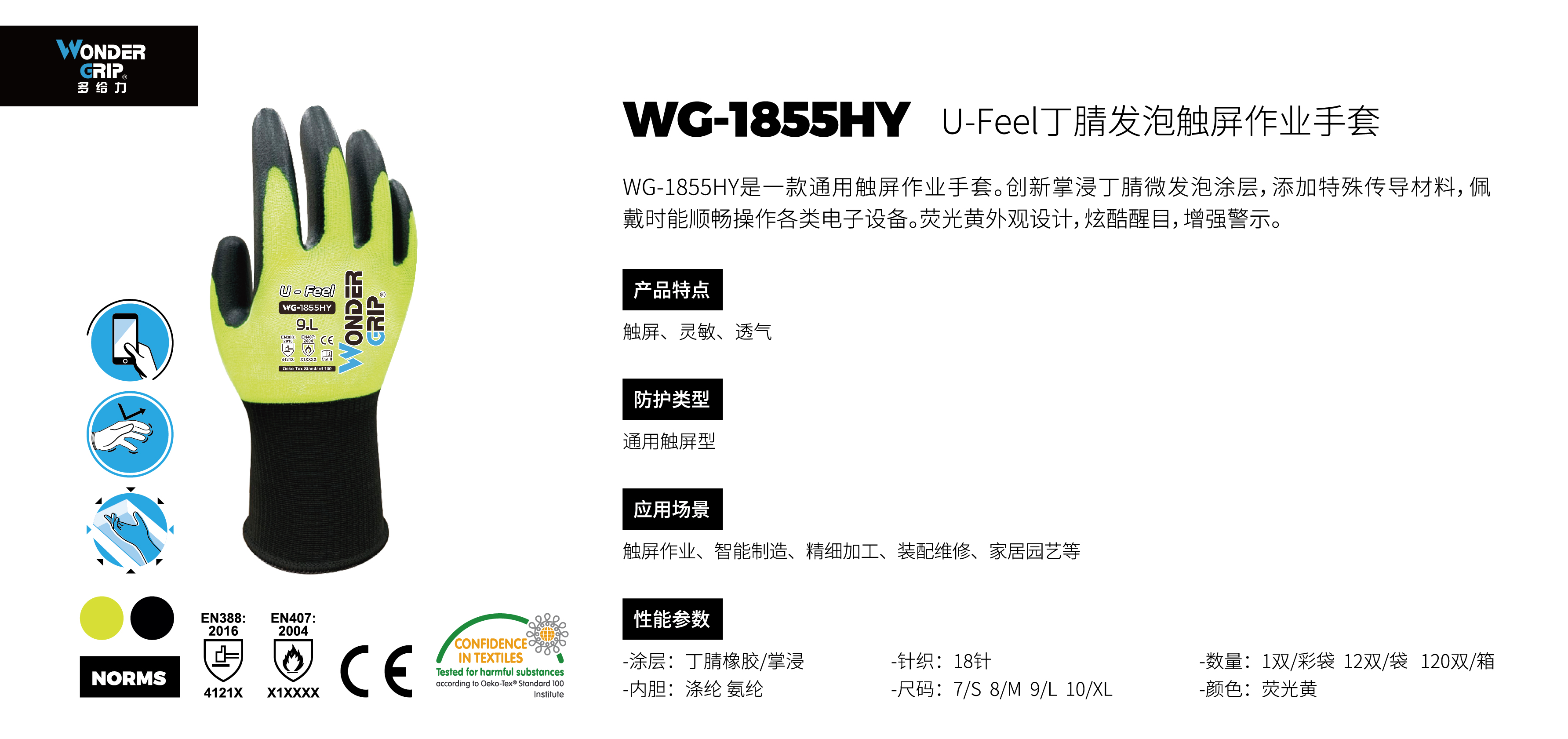 產(chǎn)品名稱:多給力 WG-1855HY 丁腈發(fā)泡觸屏作業(yè)手套 產(chǎn)品描述: 可觸屏靈活防護(hù)手套; 輕薄透氣貼合手型,更兼具防護(hù)性能; 耐磨損,耐切割,耐撕裂,精細(xì)操作; 推薦行業(yè): 通用作業(yè),觸屏操作,裝配維修,汽車汽保,精細(xì)作業(yè),園藝菜園;