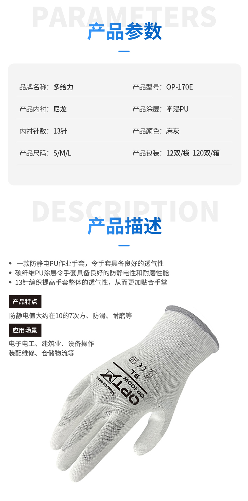 產(chǎn)品名稱(chēng):多給力 OP-170E 防靜電手套 產(chǎn)品描述: 碳纖維PU防靜電和耐磨性能; 13針編織,提高手套的透氣性; 推薦行業(yè): 機(jī)械,精細(xì)加工,裝配維修,包裝檢驗(yàn),汽修汽保,基礎(chǔ)防護(hù);
