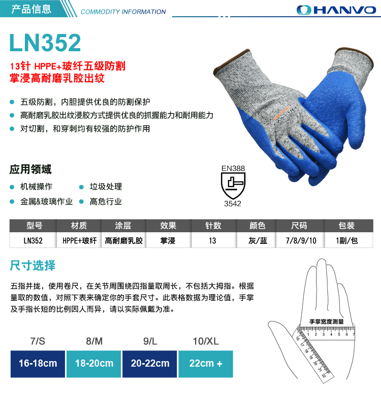 產品名稱:恒輝 LN352 浸膠5級防割手套