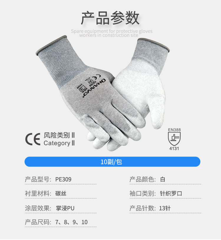 手掌、指尖聚氨酯涂層提供良好的抓握性;