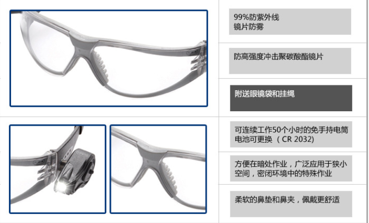 產(chǎn)品名稱:3M 11356防護(hù)眼鏡(帶雙射燈 防霧)